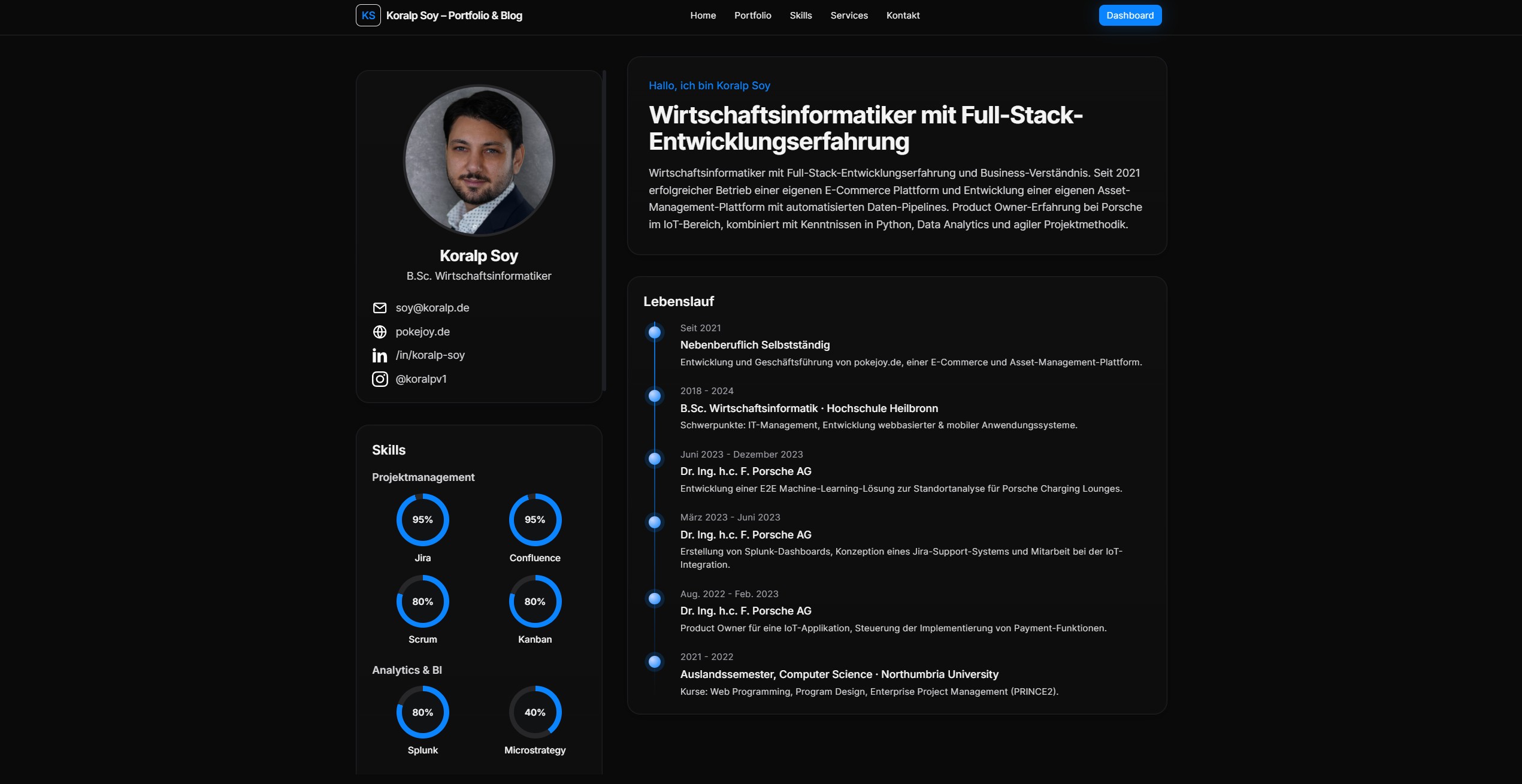 Ein dynamisches Portfolio + Blog + Lebenslauf mit einfachem Admin-Bereich. Du kannst Projekte, Skills, Lebenslauf-Einträge und Blogposts bequem pflegen.