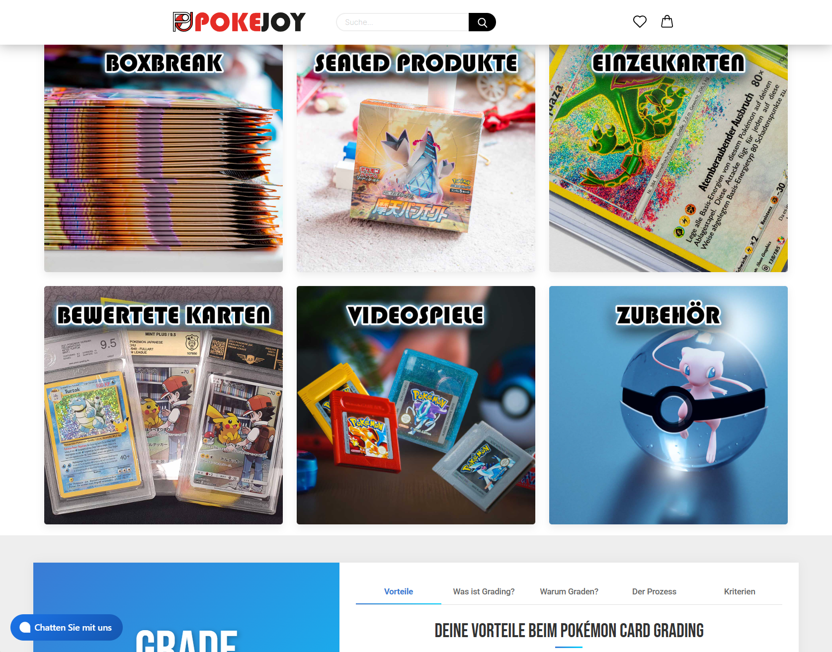 Dieser Online-Shop, pokejoy.de, ist auf Pokémon-Sammelkarten spezialisiert und bietet Boxen, versiegelte Produkte, Einzelkarten und bewertete Karten sowie Zubehör und Videospiele an.